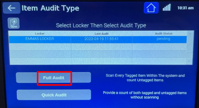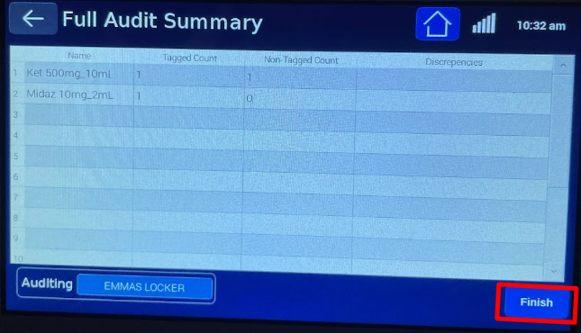 Full Audit Non-Tagged Medications Select ‘Manage Inventory’ Enter User(s) Credentials - PIN/RFID/BIO Select ‘Audit’ If you have multiple lockers, select desired Locker (1 Locker at a time) Select ‘Full Audit’ Select ‘Next’ to skip scanning RFID meds ...