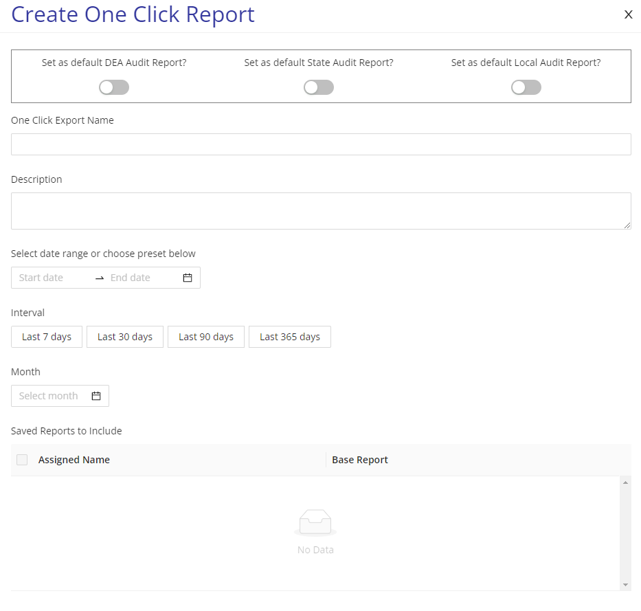 NarcTrak Pro allows you to have access to all of the reports in the Export Center. You can specify which boxes, users, medications (RFID and/or name), dates (including intervals and ranges), lockers, pouch tags, and so much more to get a specific report and get the information that you need. In the Export Center you can also save specific reports that you like to look at every month or would like to access quickly with the same data ranges. The one click reports are also included with NarcTrak Pro. This allows you to put certain reports together in a group and get them all at the same time. This is very beneficial when it comes to DEA audits because you can have everything they need right in one click! A picture is listed below of all the things included in creating a one click report. The second picture below shows how you add a report to your saved reports. All you do is select save and then add the name and you will be able to find the report in the Saved Reports tab.