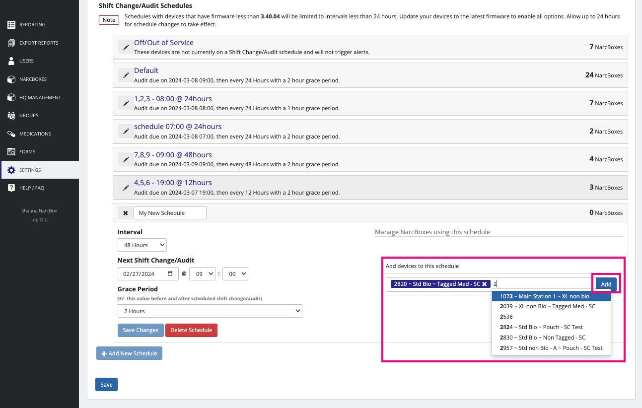 *If you have had any devices assigned to a Shift Change / Audit schedule, a unique schedule will automatically be created for you, and your NarcBoxes will be assigned to the schedule accordingly.