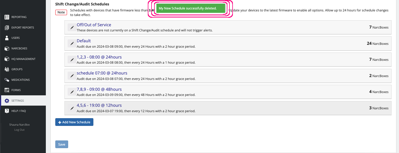 After the schedule box opens you must move all NarcBox(es) to another Shift Change/Audit schedule before deletion is allowed. Once all NarcBox(es) are moved select 'Delete Schedule'.